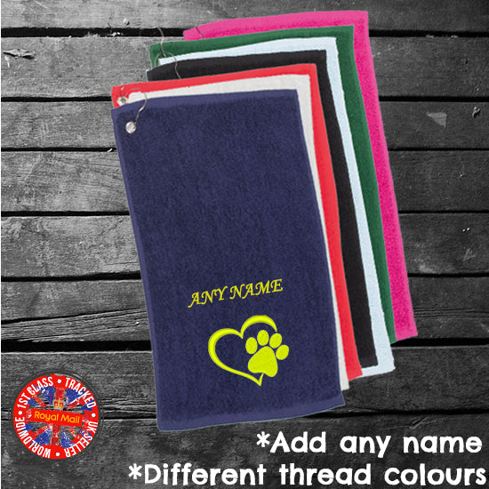 Personalised luxury dog walking towel with soft, deep pile and excellent absorbency. Featuring a herringbone border with a convenient grommet and hanging loop. Available in a wide selection of popular colours.