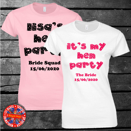 You can personalise your t-shirts with your hen party info on the front of the t-shirts by messaging or leaving a note to seller.